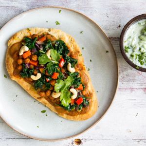 Door naanbrood besmeerd met tikka-massalayoghurt knapperig te bakken, krijg je een heerlijke Indiase pizza! Getopt met kruidige kikkererwten, gewokte groenten en een frisse komkommersalade verander je de klassieke Italiaanse pizza in een Indiaas feestje.